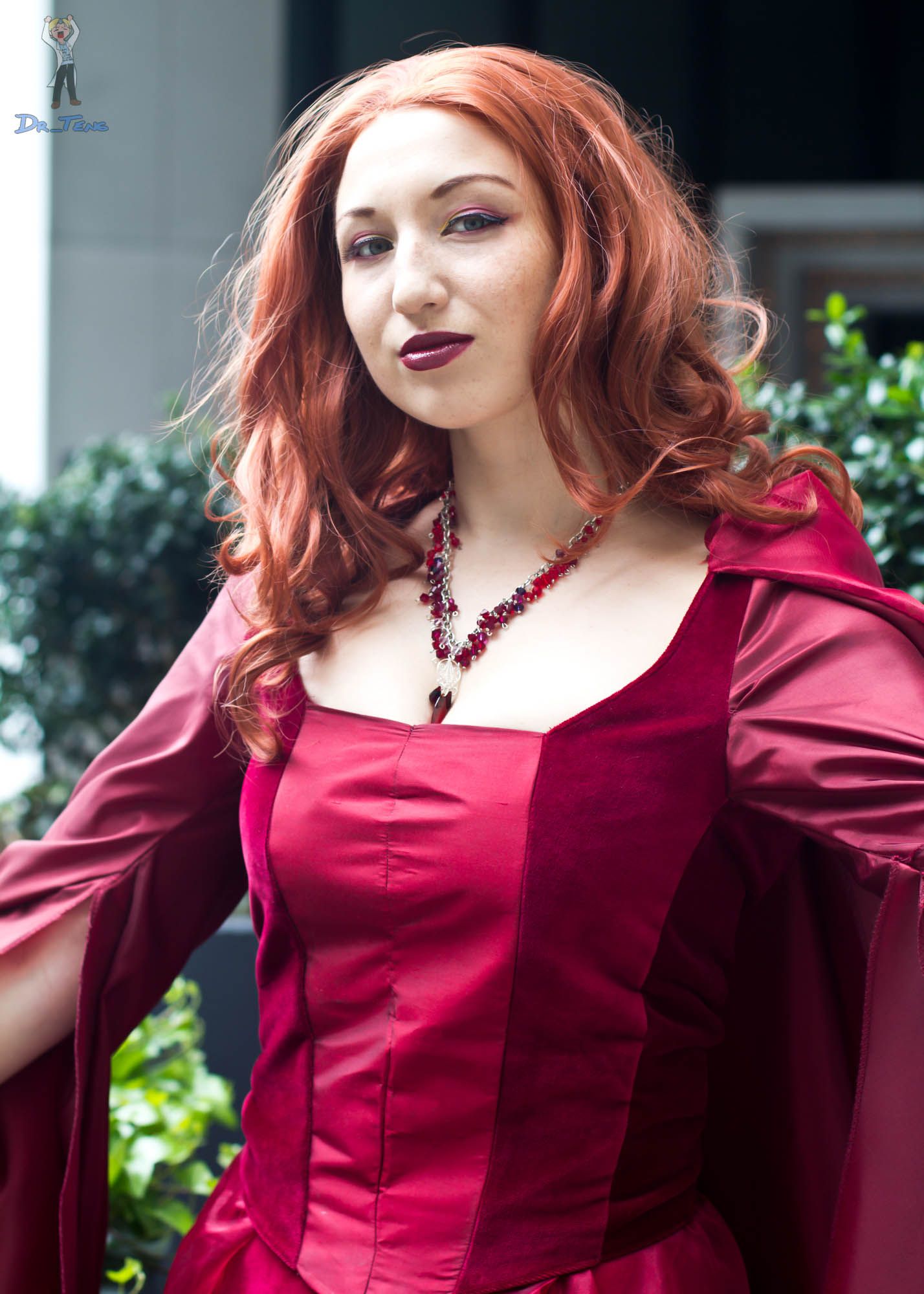 I based her costume off of book descriptions because I found her series costumes less elegant, but was also mindful of staying in the dark red color range so it didn’t look gimmicky. The entire costume was patterned by me and made in about three days, though I like it despite being a bit of a rush job. The bodice was made out of varying interfaced panels of dupioni silk and velvet, with the sleeves, cloak and cowl out of taffeta and lined with organza. The necklace was made by me out of numerous red crystals, I wish it photographed better to show detail.