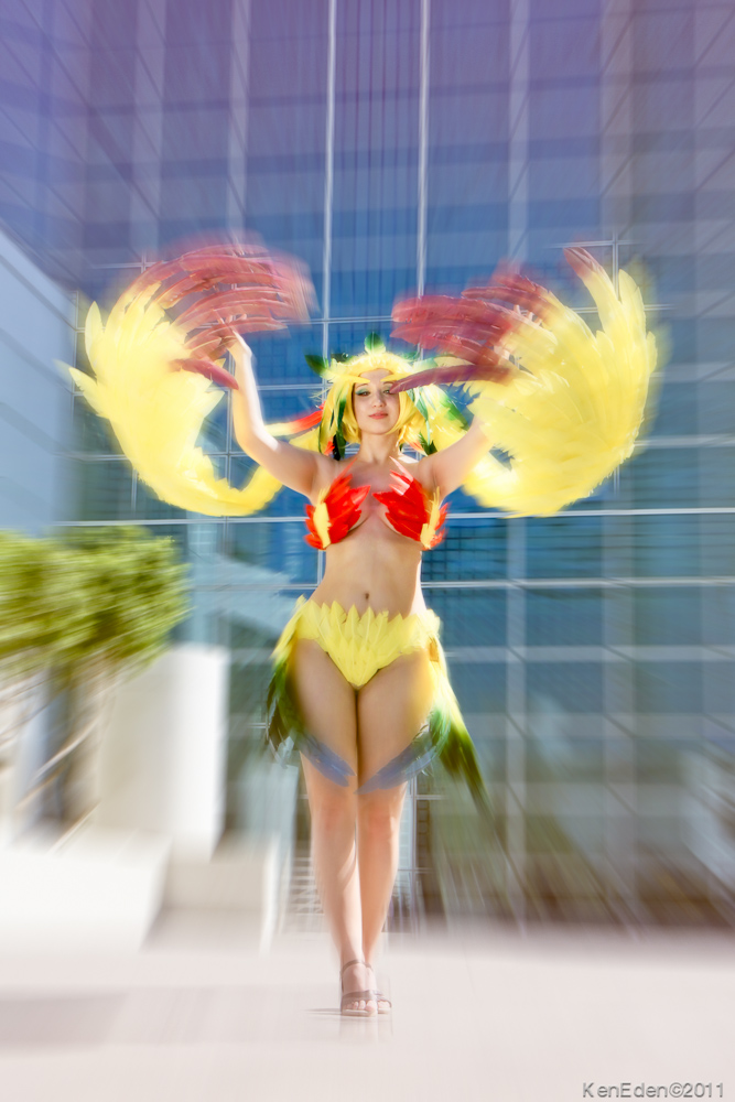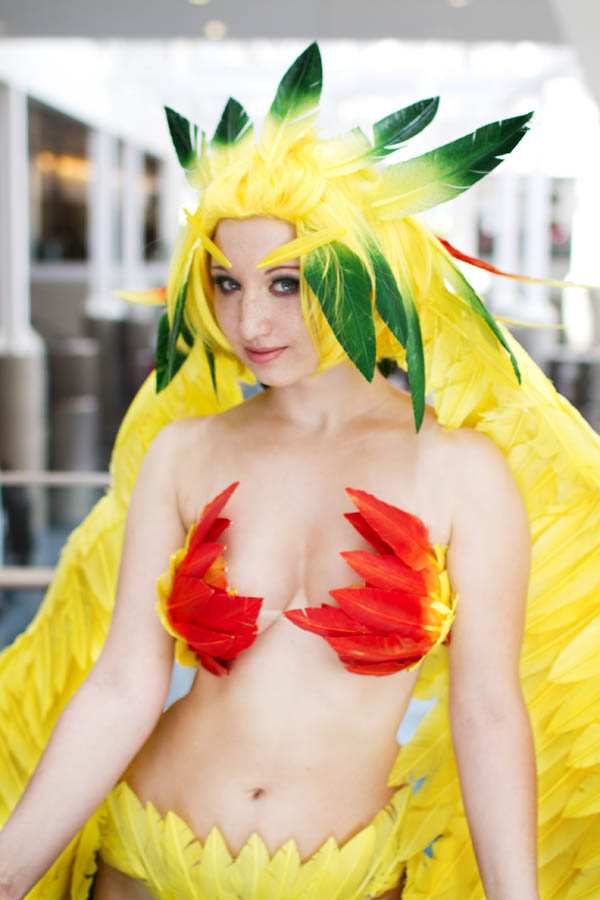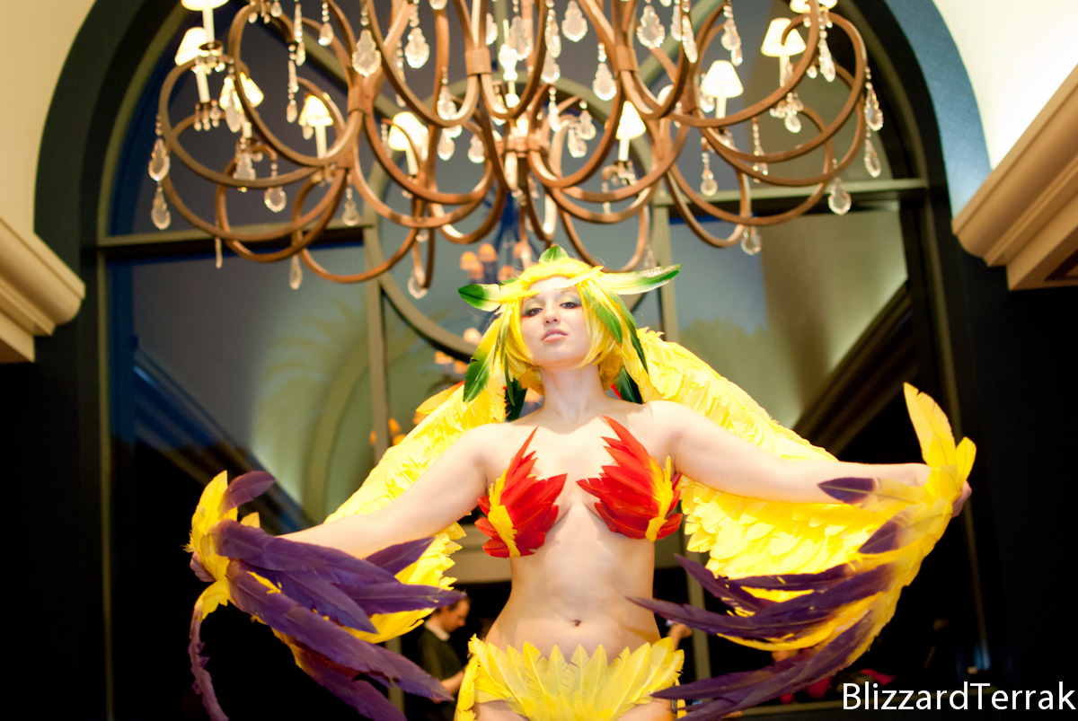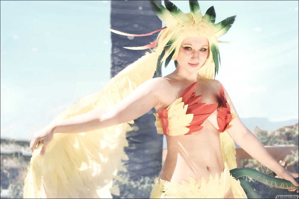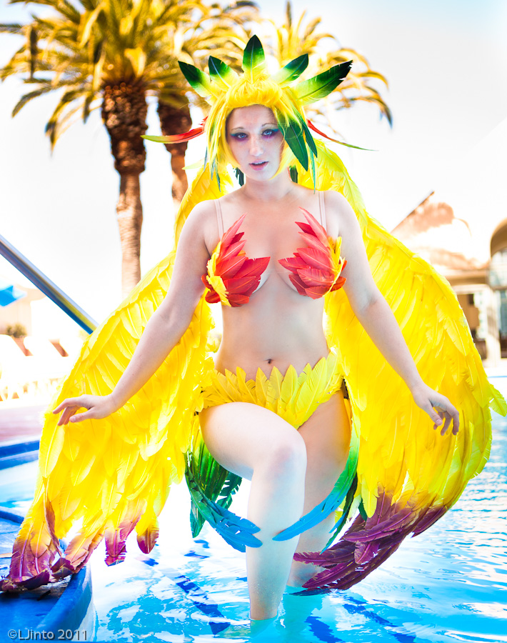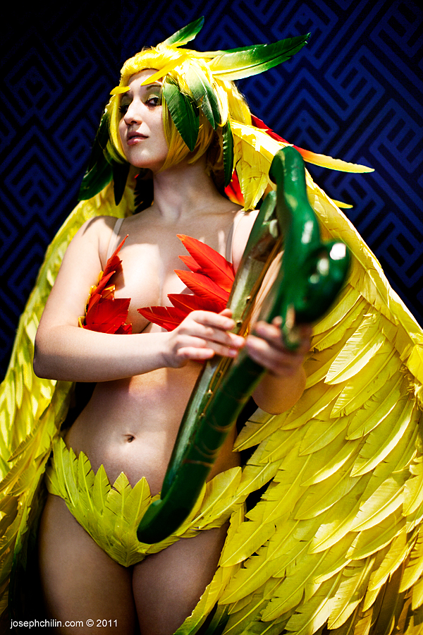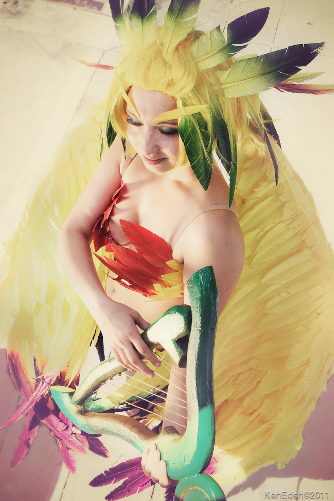 A custom bra was built for the feathers at the bust and created several layers so nothing would be exposed, and did the same with the torso and tail feathers. The rainbow makeup actually takes the longest in changing into this costume, and the eyebrows are thin yellow feathers glued with spirit gum. My gorgeous harp was made by Lionel Lum out of balsa wood.